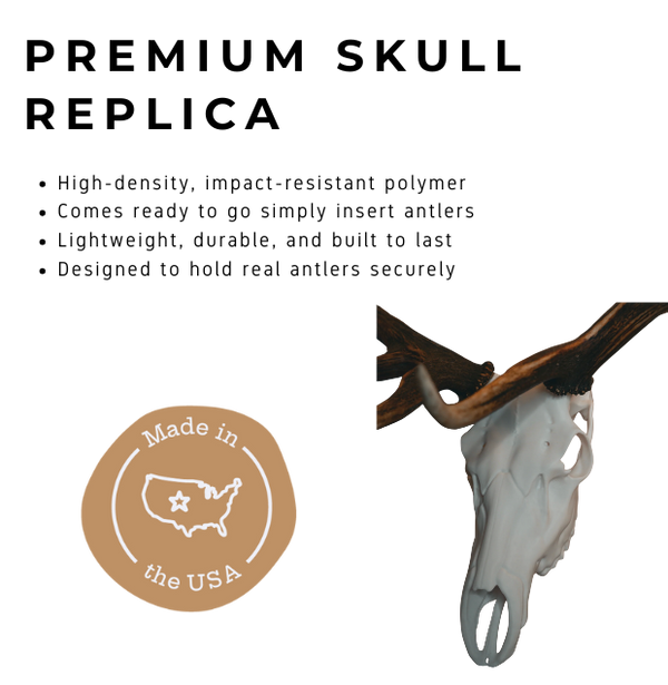Each order will come with a beautiful set of matched shed antlers, a premium replica skull, and a mounting bracket for your wall. The set will come 95% assemled, meaning you will only have to mount the bracket to your wall and snap the antlers into place.